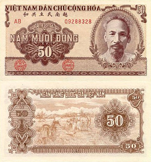 Lần thứ nhất: Sau Cách mạng Tháng Tám 1945, nước Việt Nam Dân Chủ Cộng Hòa ra đời, tiền đồng cũng chính thức được in và lưu thông để khẳng định chủ quyền của đất nước tự do. Bắt đầu từ thời điểm này cho tới nay, chúng ta đã thay đổi tiền cả về hình thức, chất liệu đến mệnh giá 7 lần. Trước khi Ngân hàng Nhà nước Việt Nam ra đời, trên mỗi tờ tiền đều in chữ "Việt Nam Dân Chủ Cộng Hòa" bằng chữ quốc ngữ, chữ Hán và hình Chủ tịch Hồ Chí Minh. Mặt sau của tờ tiền thường in các hình ảnh khác về giai cấp Nông - Công - Binh. Các con số ghi mệnh giá đều được viết theo số Ả- Rập hoặc bằng chữ Hán, Lào, Campuchia. Người Việt Nam thời ấy luôn gọi tiền giấy là “giấy bạc Cụ Hồ”.